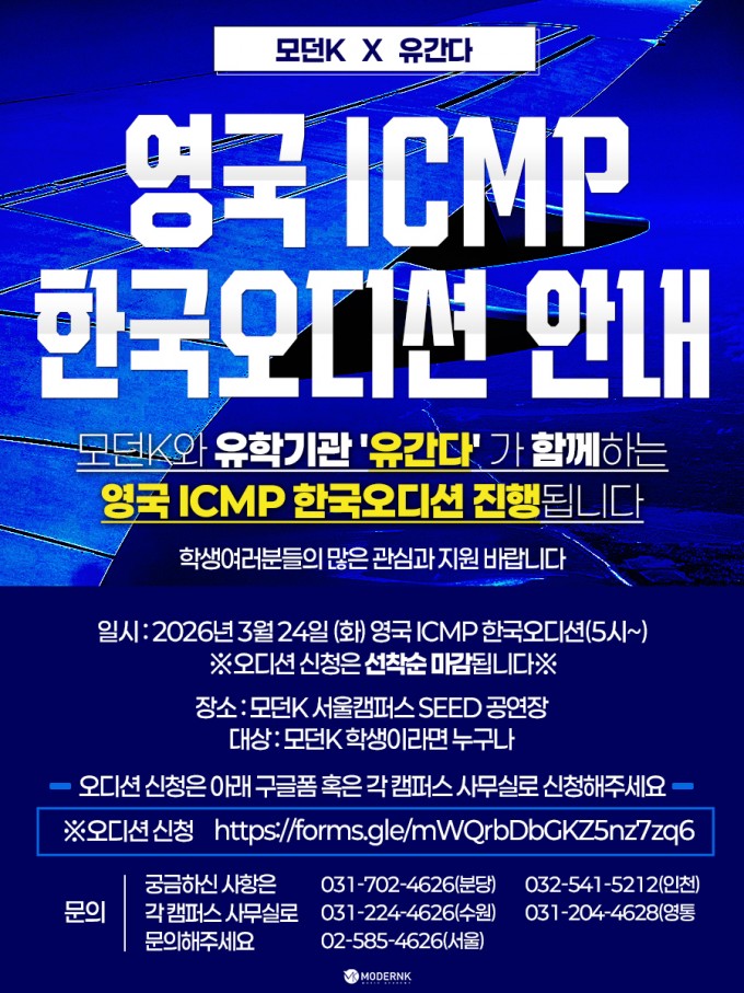 모던K와 유학기관 '유간다' 가 함께하는 영국 ICMP 한국오디션 진행됩니다