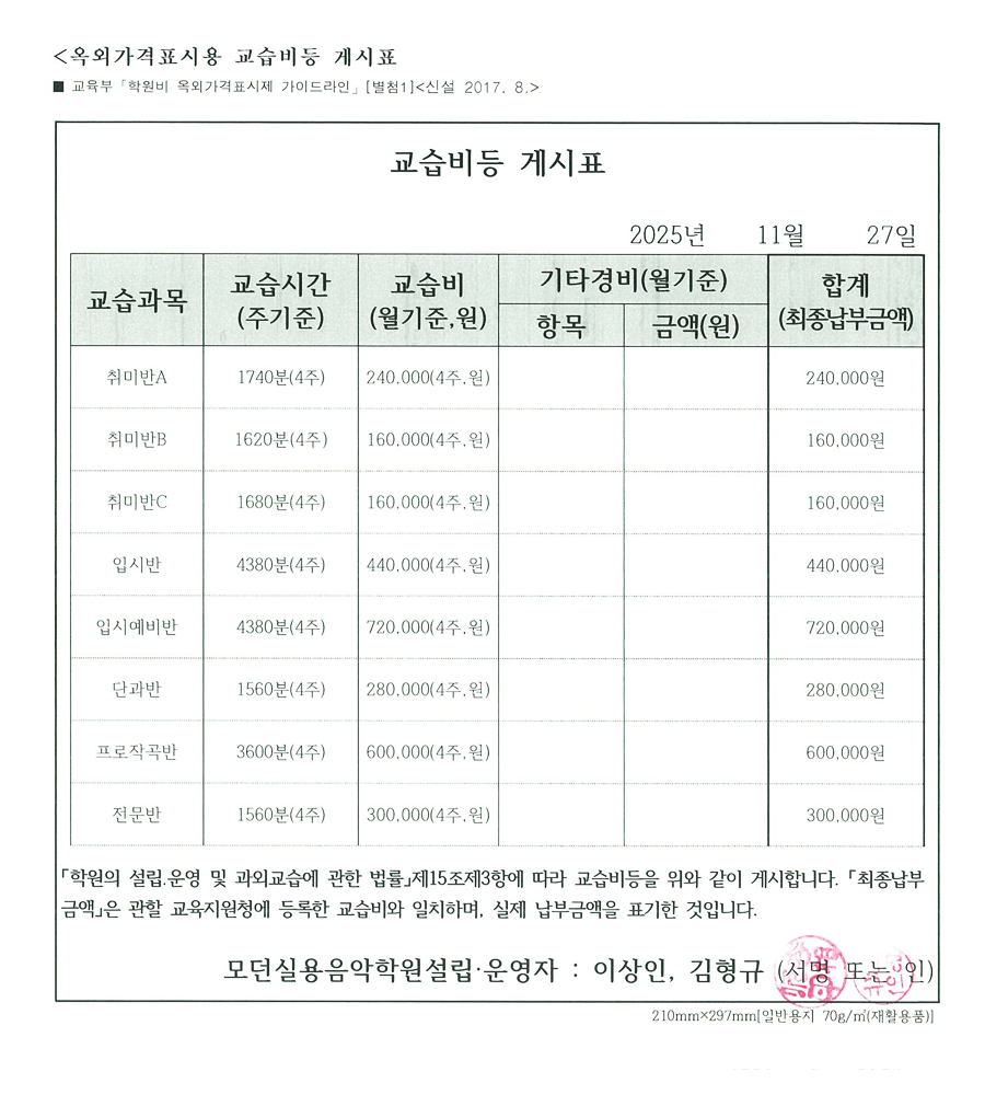 모던k실용음악학원 지점별 교습비게시표 및 교육청등록신고번호 안내