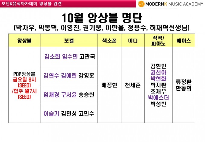영통캠퍼스 10월 앙상블 명단입니다. 확인 후 결석 및 지각에 주의해주세요.